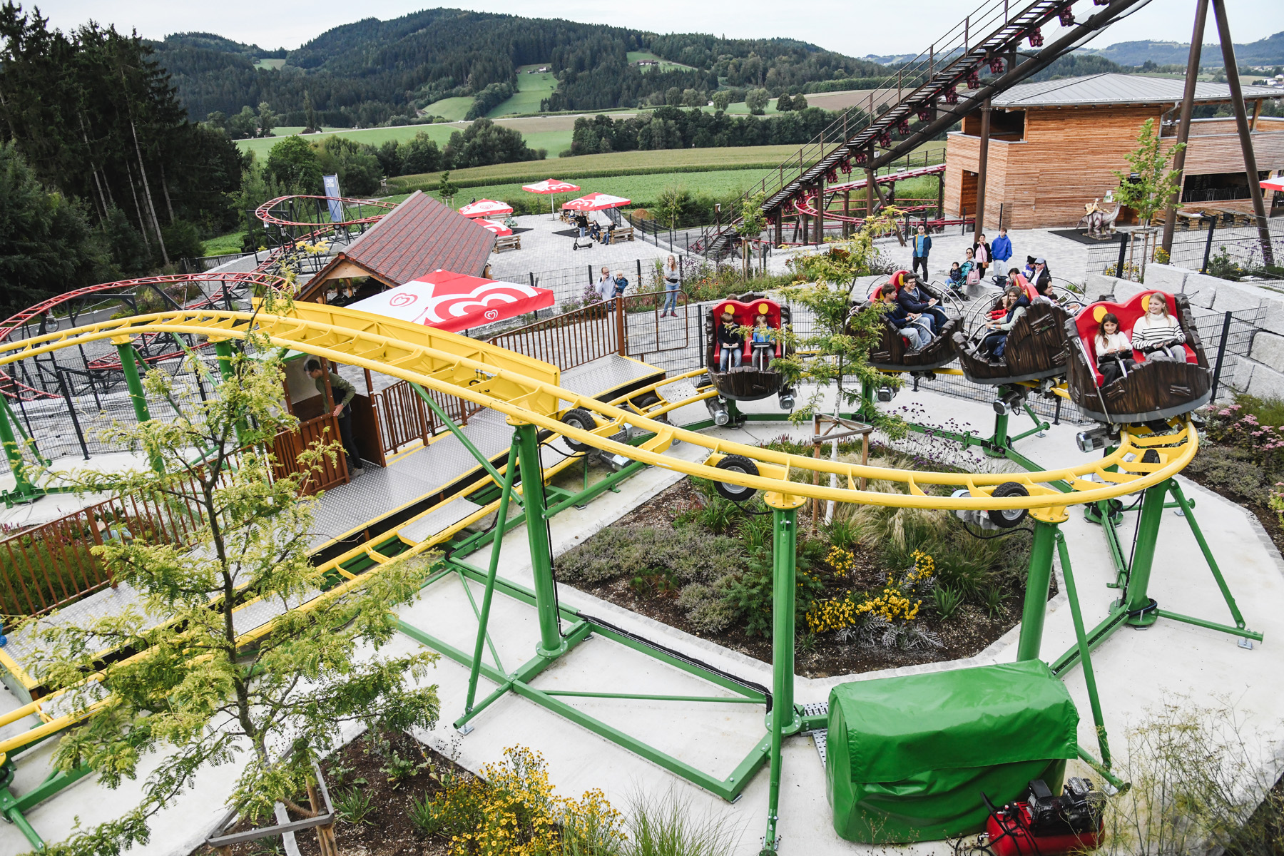 Unsere neue Dinoachterbahn ist etwas ganz Besonderes, denn hier drehen sich die Wagen nochmals um die eigene Achse und geben damit einen ganz speziellen Fahrspaß. Jede Runde ist anders.